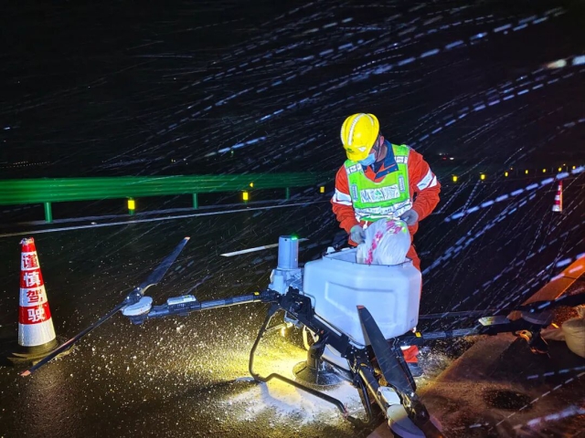 亳州中心蒙城保暢分中心工作人員在雙澗樞紐使用無人機撒布融雪劑