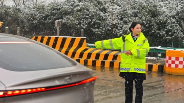淮南中心鳳臺北站收費人員為車輛清理車牌積雪