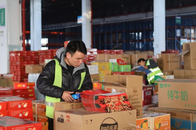 迅捷物流公司倉配一體化項目員工正在倉庫按需發(fā)貨