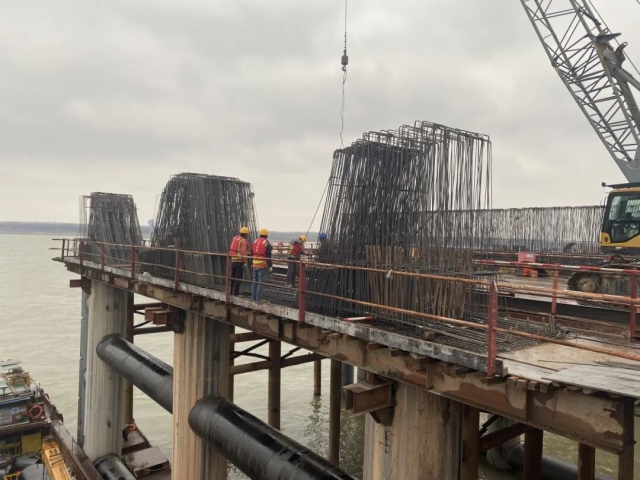 交控資源公司東流港口碼頭施工隊伍正在進行鋼筋綁扎