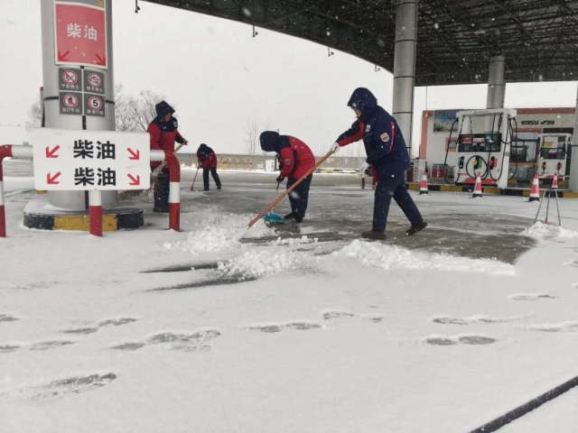 驛達(dá)服務(wù)區(qū)在易滑區(qū)域鋪設(shè)防滑墊并設(shè)置警示牌,在廣場、通道等易結(jié)冰路面,及時撒布融雪劑,并備足各類除雪防滑物資。依托“司機(jī)之家”“U+幸福驛站”等載體,組織志愿者為司乘提供姜茶熱飲、便民藥箱等貼心服務(wù)。加油站板塊統(tǒng)籌優(yōu)化資源調(diào)配,積極協(xié)調(diào)成品油資源,根據(jù)天氣預(yù)警情況,提前向受惡劣天氣影響的重點(diǎn)路段加油站增配庫存。各加油加氣站提前備足防滑墊、鐵鍬、掃帚等應(yīng)急物資,及時清理加油區(qū)及進(jìn)出口通道積雪。