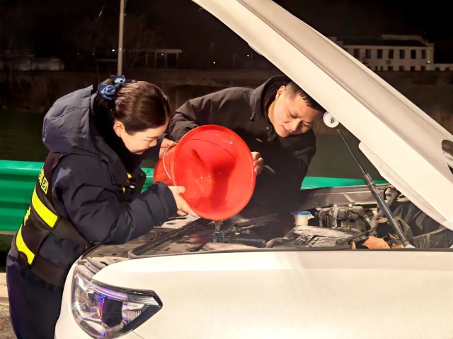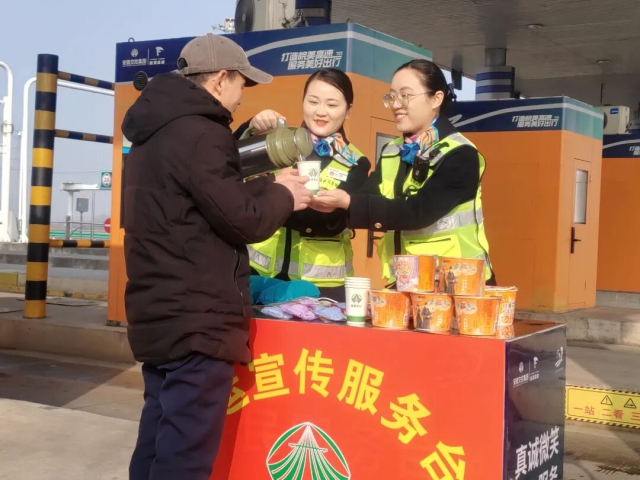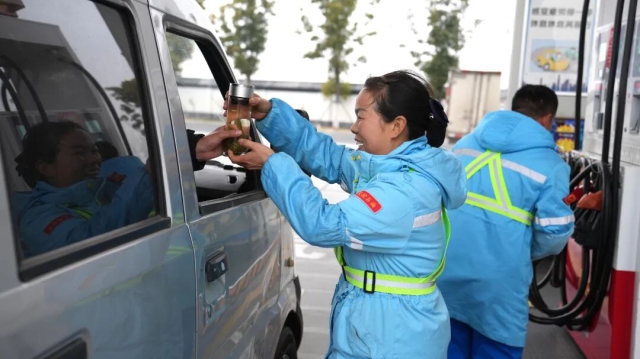 交控石油公司迎河服務(wù)區(qū)加油站員工為顧客提供熱水