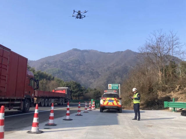 合六中心金寨保暢分中心工作人員使用無人機(jī)巡查路段車輛通行情況