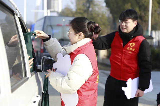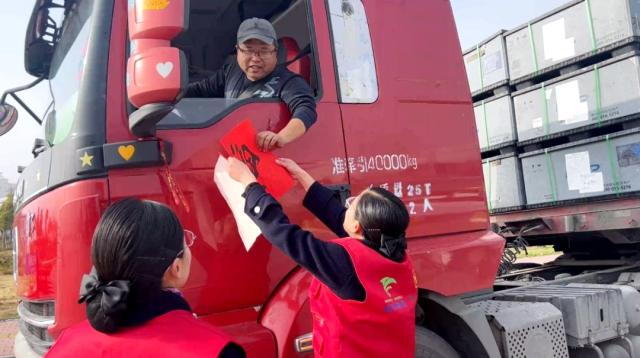 池州中心組織志愿者為過往司乘送“福”字